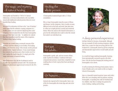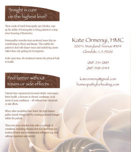 This brochure for homeopath Kate Ormenyi serves to introduce homeopathy and evokes a feeling of confidence in Kate's abilities and caring attitude.