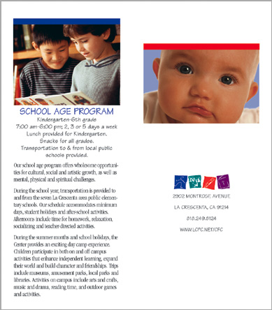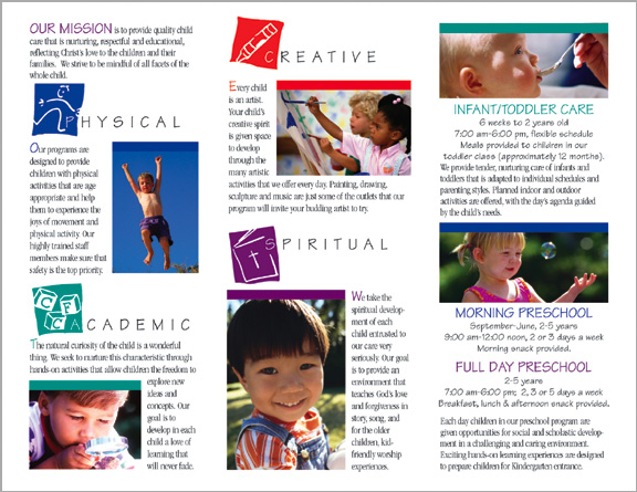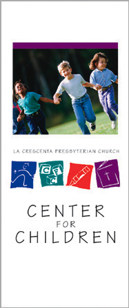 Brochure for the La Crescenta Presbyterian Church Center for Children uses bright colors and vibrant photos to evoke a quality image for this child care center.
